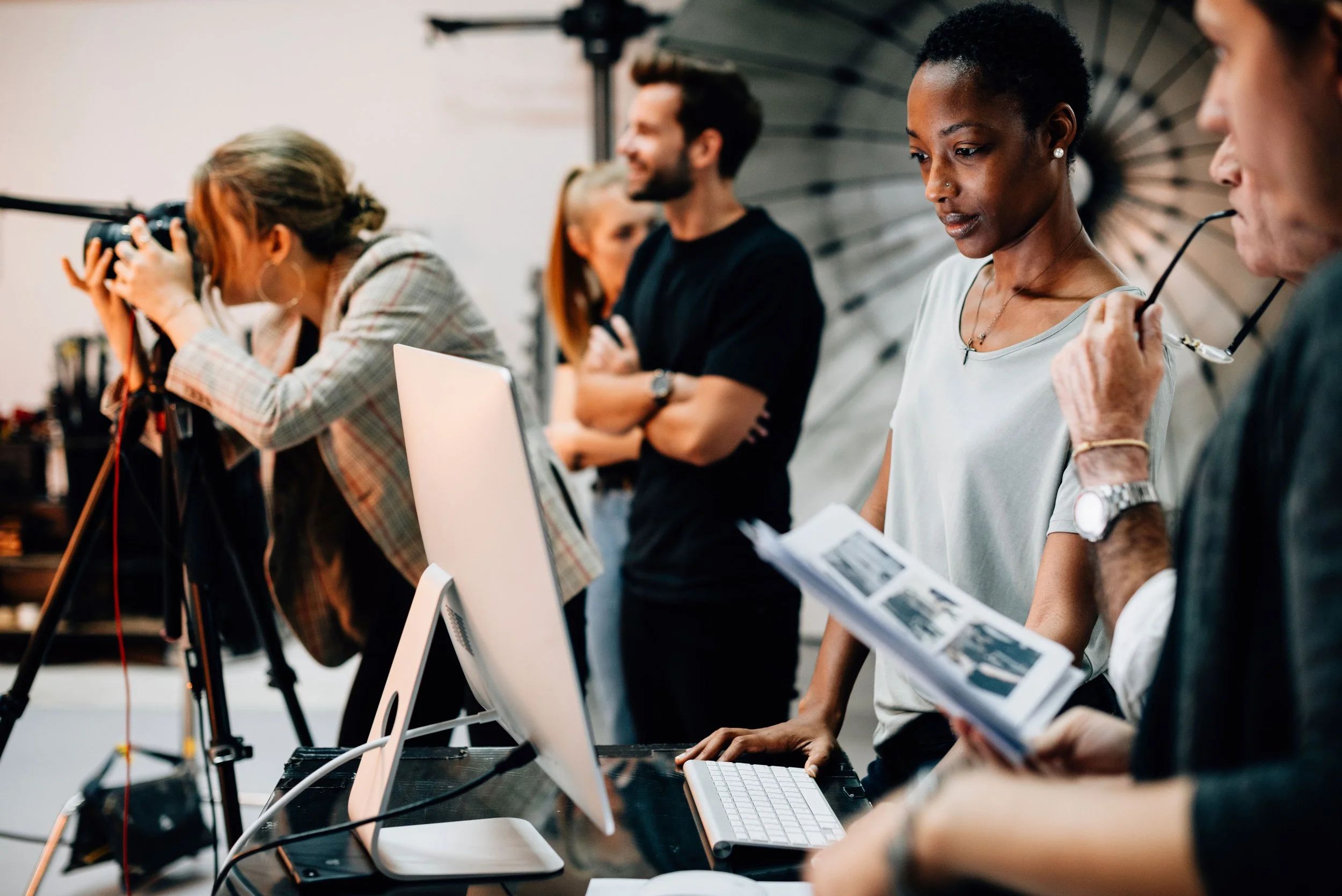 Group of people working in a photography studio, with a woman looking at a computer, a man with glasses holding a film clipboard, a woman with a camera, and others in the background.